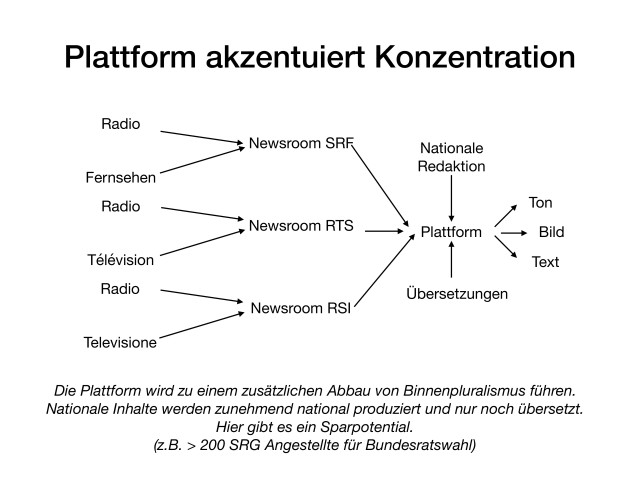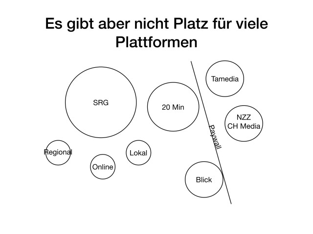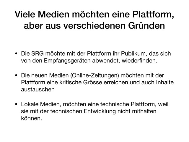 Cependant, les plateformes ne sont pas seulement un problème pour la SSR. Avec cette plate-forme, la SSR veut trouver son public, qui se détourne des récepteurs. Les nouveaux médias (journaux en ligne) veulent que la plateforme atteigne une masse critique et échange du contenu. Les médias locaux veulent une plateforme technique parce qu'ils ne peuvent pas suivre l'évolution technique.