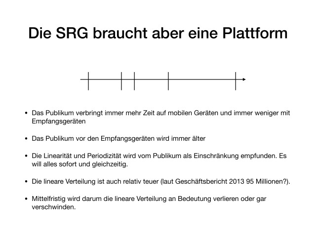 Toutefois, la SSR doit devenir une plateforme si elle veut continuer à accéder au public. Le public passe de plus en plus de temps sur les appareils mobiles et de moins en moins sur les récepteurs. Le public devant les récepteurs eux-mêmes est de plus en plus âgé. La linéarité et la périodicité sont de plus en plus perçues comme des restrictions par le public. Ils veulent tout immédiatement et simultanément. La distribution linéaire est également relativement coûteuse (95 millions selon le rapport annuel 2013) et deviendra de moins en moins justifiable. A moyen terme, la distribution linéaire va donc perdre de son importance, voire disparaître.