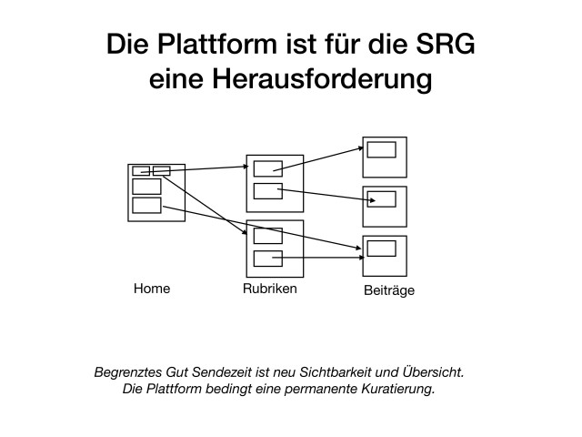 Mais la plateforme est aussi un défi pour la SSR. L'atout limité n'est plus le temps d'antenne, mais la visibilité et la vue d'ensemble. La plateforme nécessite un curateur permanent et une orientation simultanée vers différents groupes d'audience.