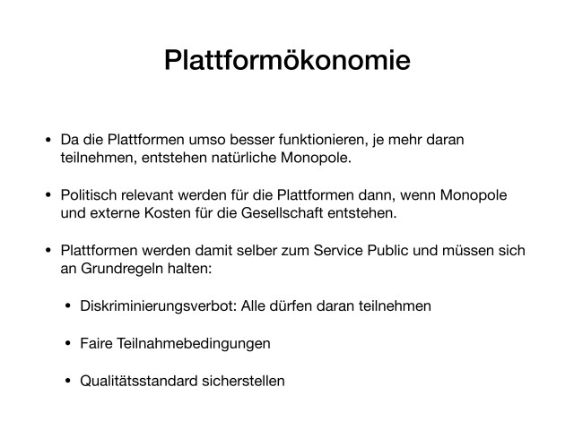 Comme les plateformes fonctionnent d'autant mieux qu'elles participent davantage, des monopoles naturels émergent. Lorsque les monopoles créent des coûts externes pour la société, elles deviennent un sujet politique. Il faut considérer les plateformes elles-mêmes comme des services publics qui doivent respecter des règles de base : chacun peut participer, des conditions de participation équitables s'appliquent et un standard de qualité doit être garanti.