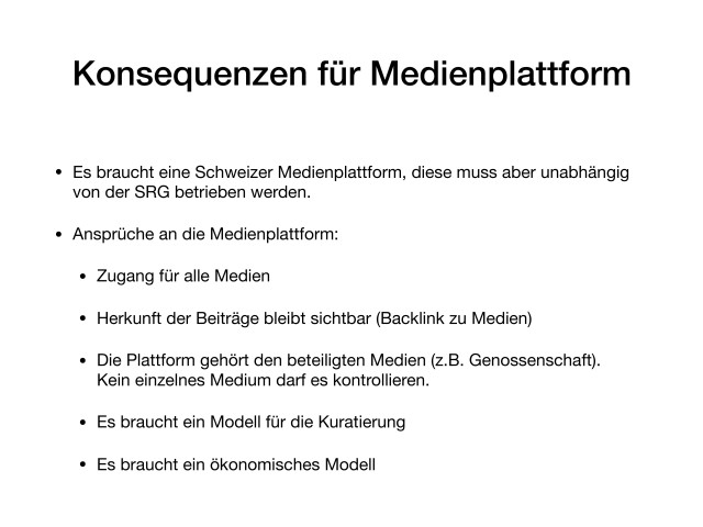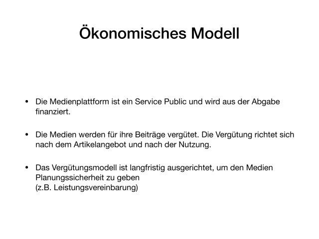 La plateforme médiatique est un service public et est financée par la redevance. Les dimensions visées sont de 5 millions pour les opérations techniques et de 50 à 100 millions pour le contenu. Les médias seront rémunérés pour leurs contributions. La rémunération est basée sur le catalogue d'articles proposés et leur utilisation. Ceci est basé sur des modèles de rémunération à long terme qui assurent la sécurité de la planification.