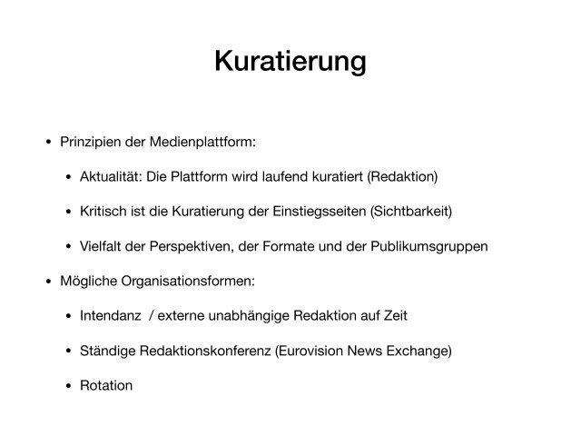 La plateforme médiatique permet aux utilisateurs de mettre en place leurs propres offres thématiques en fonction de leurs intérêts. En fait, à l’instar d’un réseau social, la plateforme pourrait avoir un millier de curateurs, qui recommandent leur choix des articles. En tant que service public, la plateforme ne fait cependant pas de publicité et ne transmet pas les données d'utilisation enregistrées à des tiers.